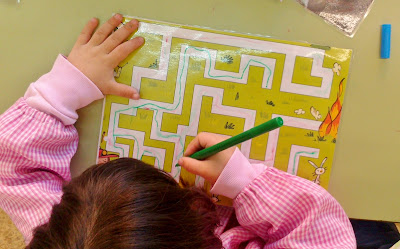 De varios juegos que tenemos en la escuela de láminas o fichas que hemos plastificado hemos hecho una buena caja. Trabajamos el trazo, la coordinación óculo-manual, la tonicidad de los músculos necesarios para realizar la actividad y la atención. Muy completa!